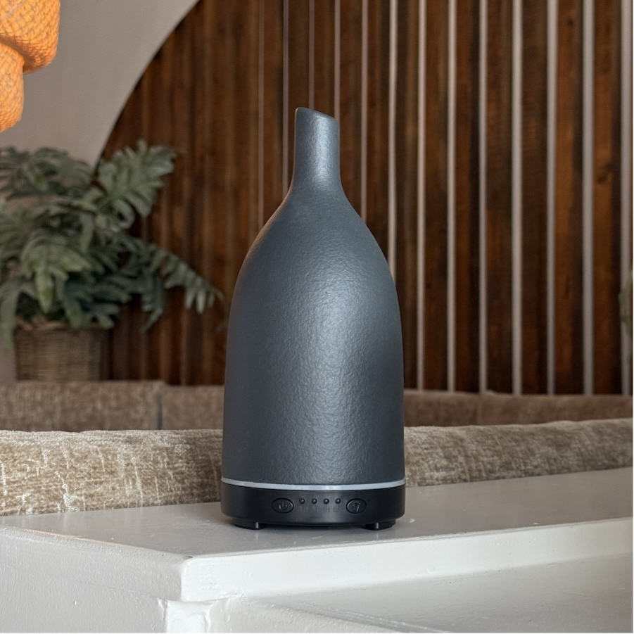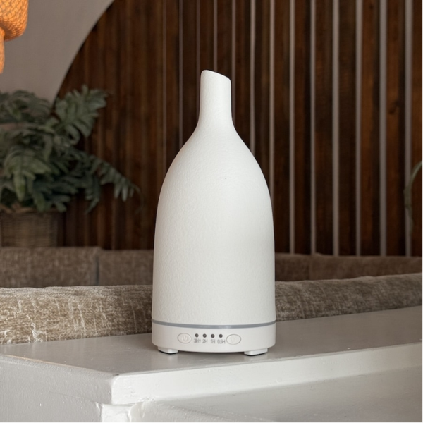 Een stijlvolle diffuser met een rustige uitstraling, gemaakt van keramiek. Dankzij het bedieningspaneel is hij makkelijk in gebruik en past hij in elke woon-, slaap- of praktijkruimte.